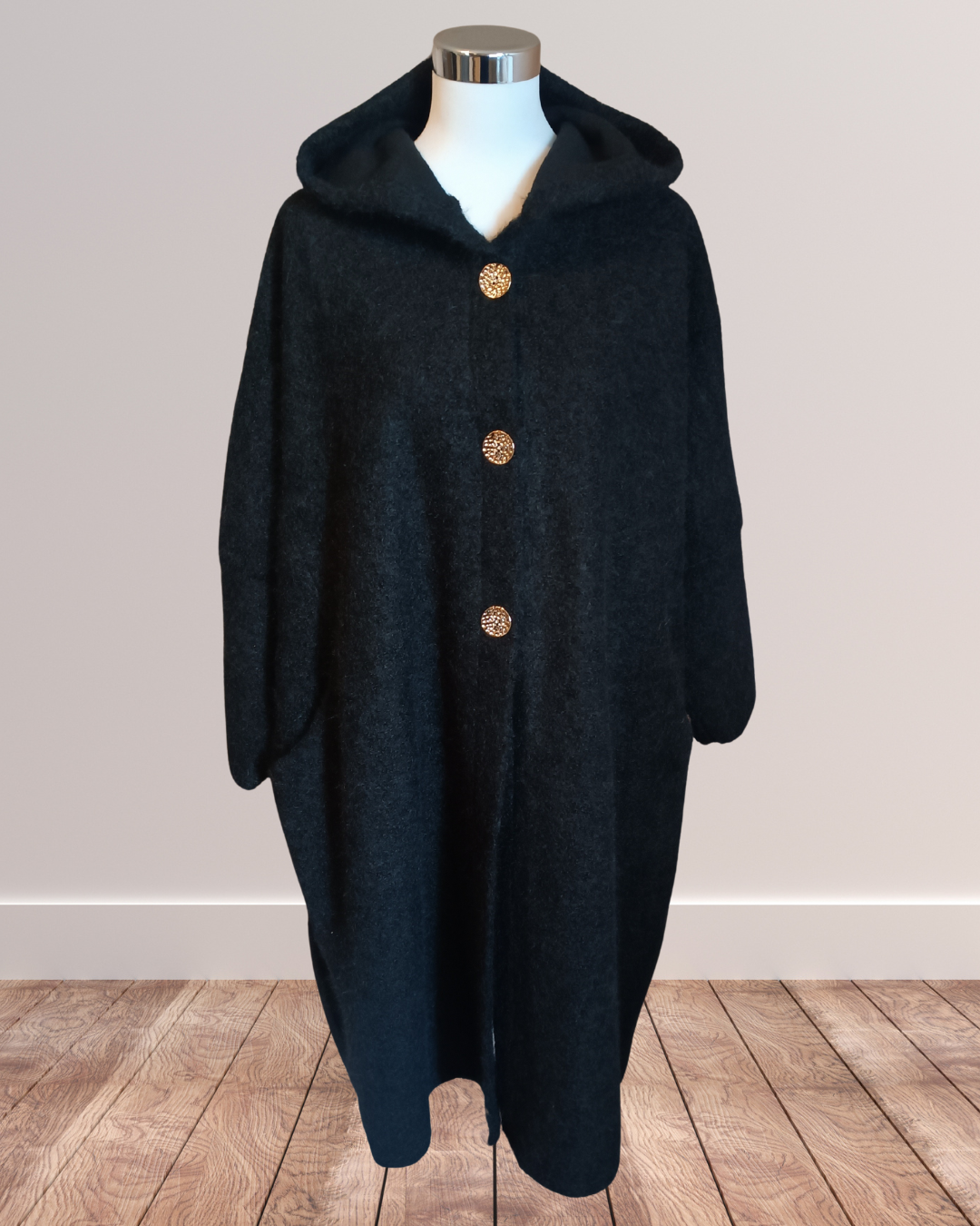 Trois boutons dorés qui illuminent le noir profond de la laine, apportant une note chic et intemporelle.