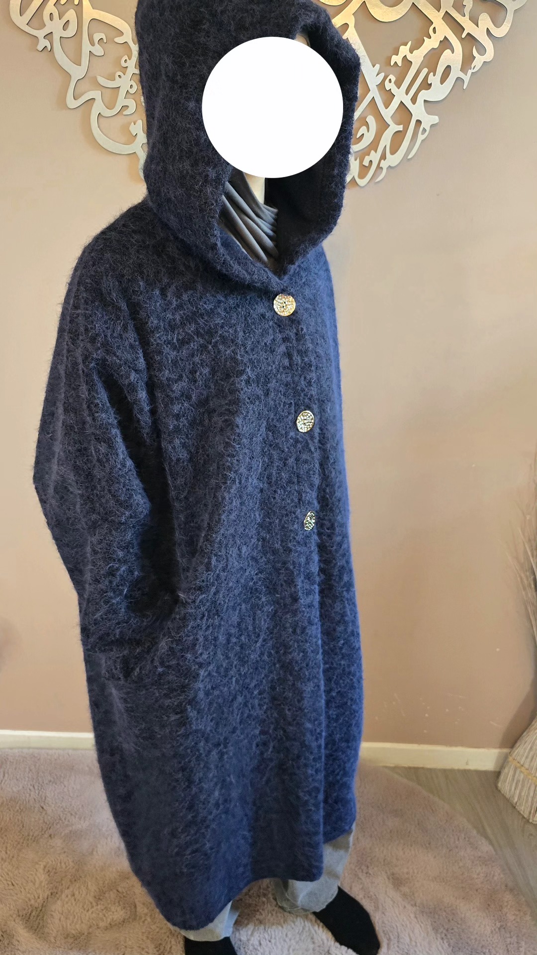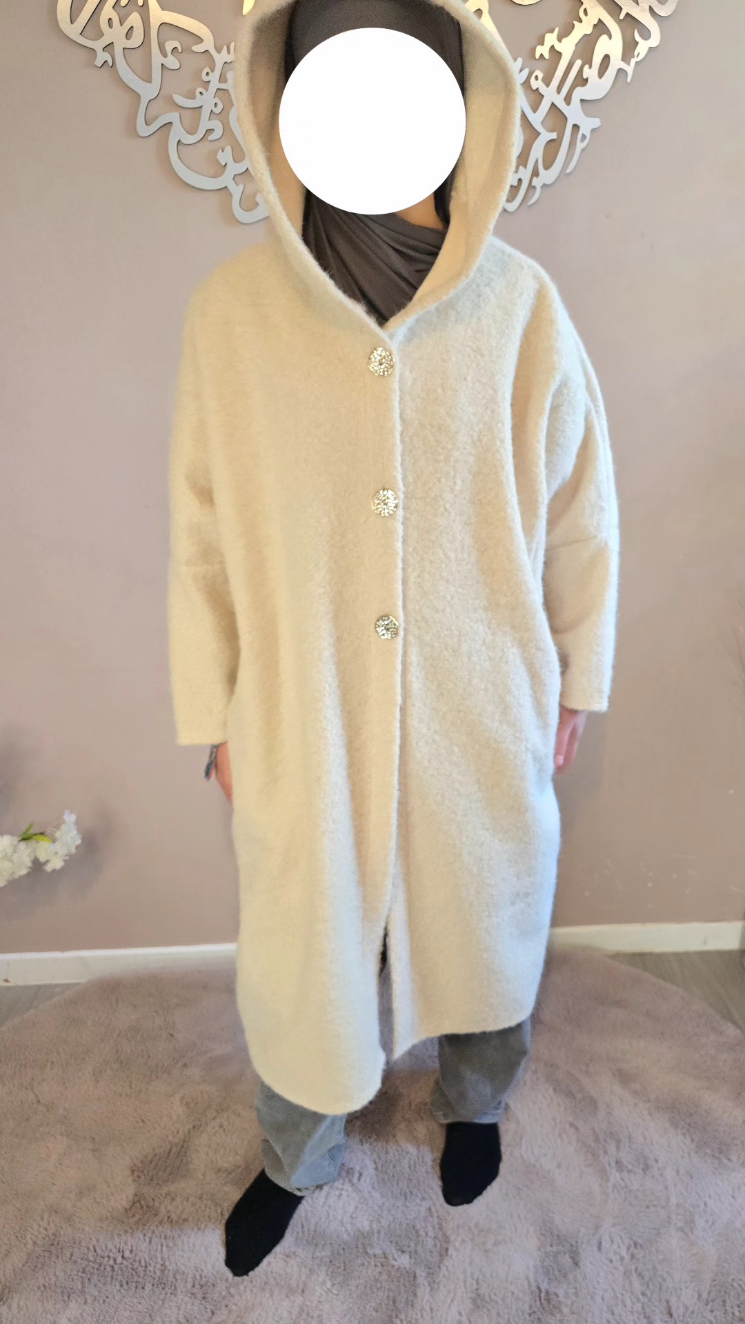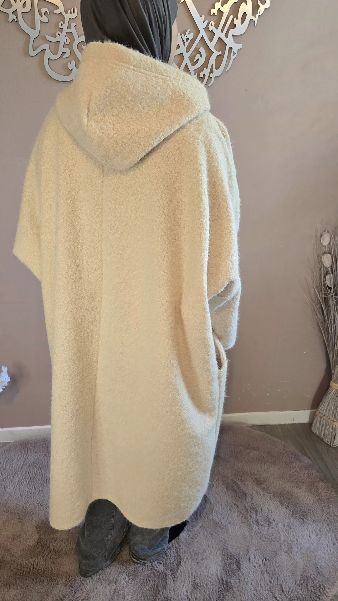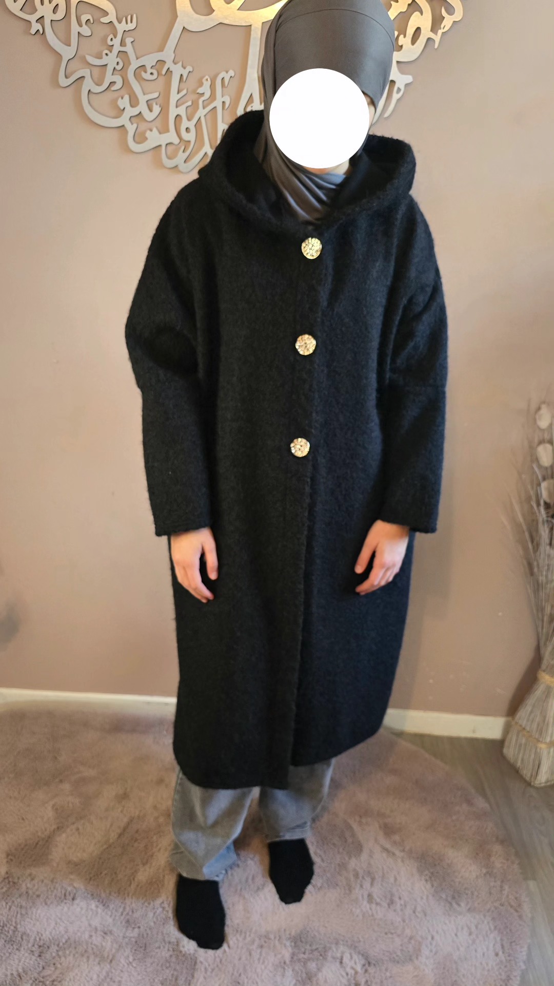 Dotée d’une capuche pratique et de trois boutons dorés sur le devant, elle marie subtilement le raffinement des détails et l’aspect fonctionnel. Ses deux poches amples latérales sont idéales pour garder les mains au chaud ou emporter l’essentiel avec soi. Avec une longueur mi-mollet (pour une taille de 1,62 m), la Veste Ruqqaya noire offre un tombé élégant qui structure la silhouette tout en allongeant la ligne.