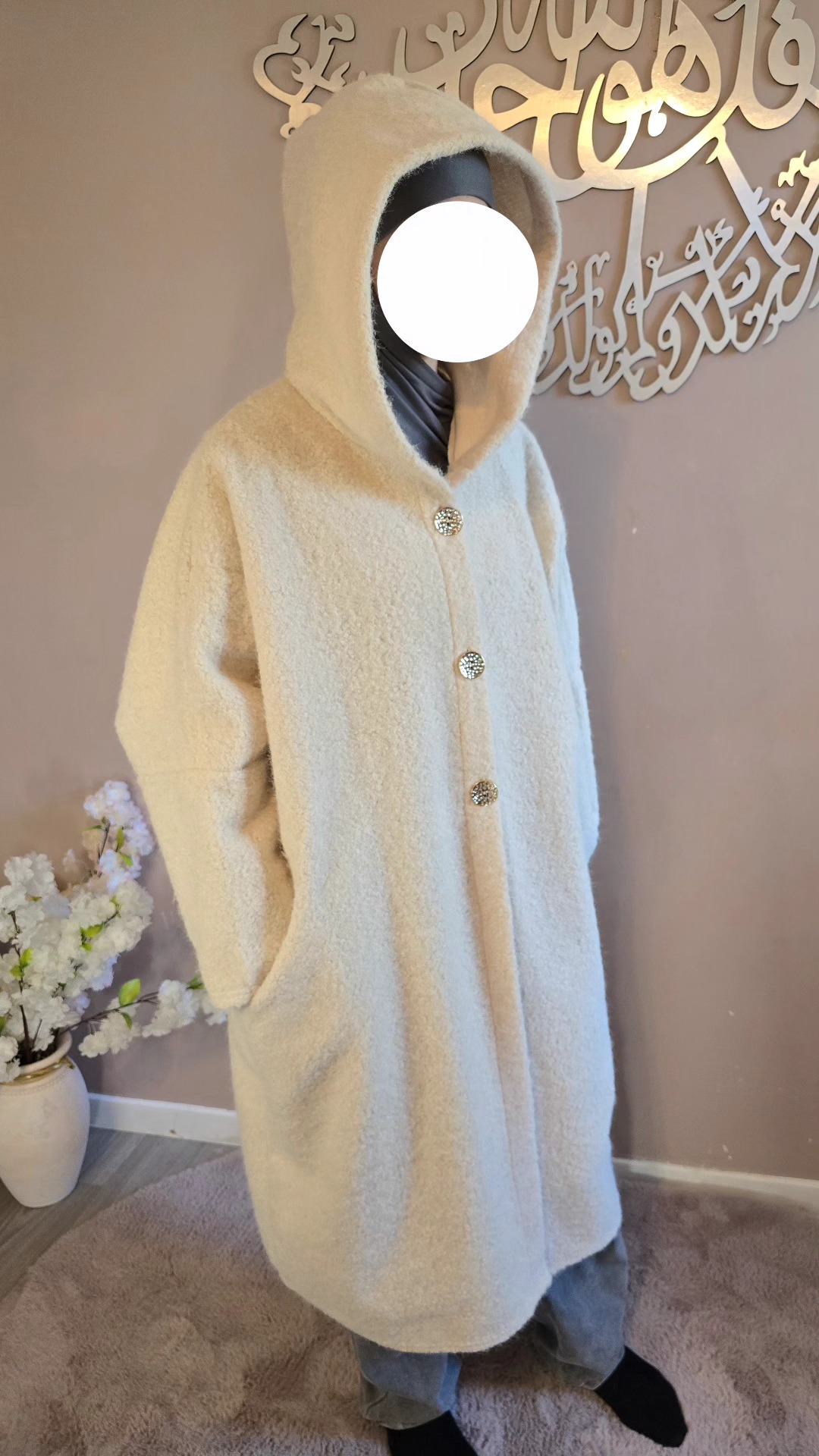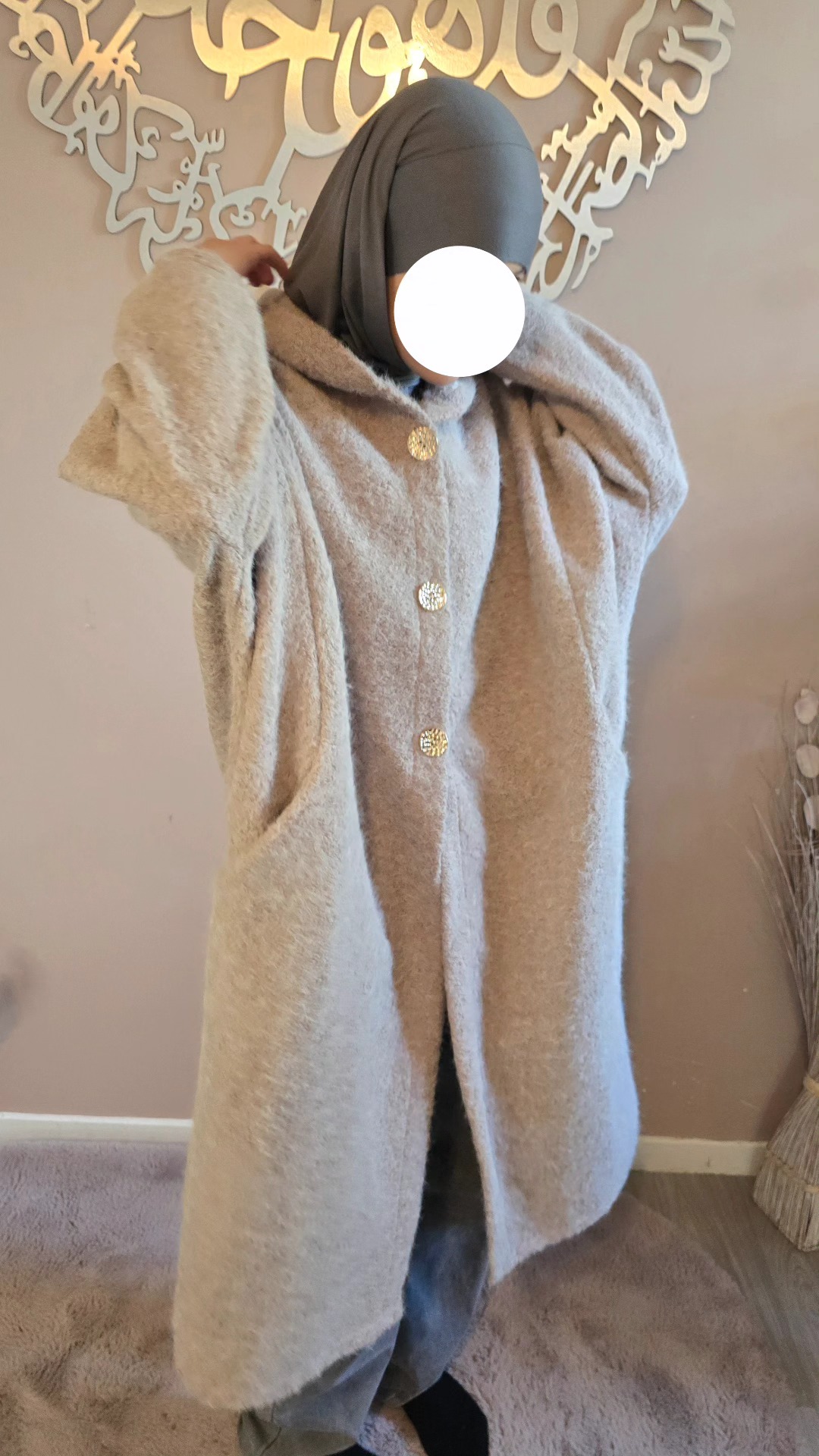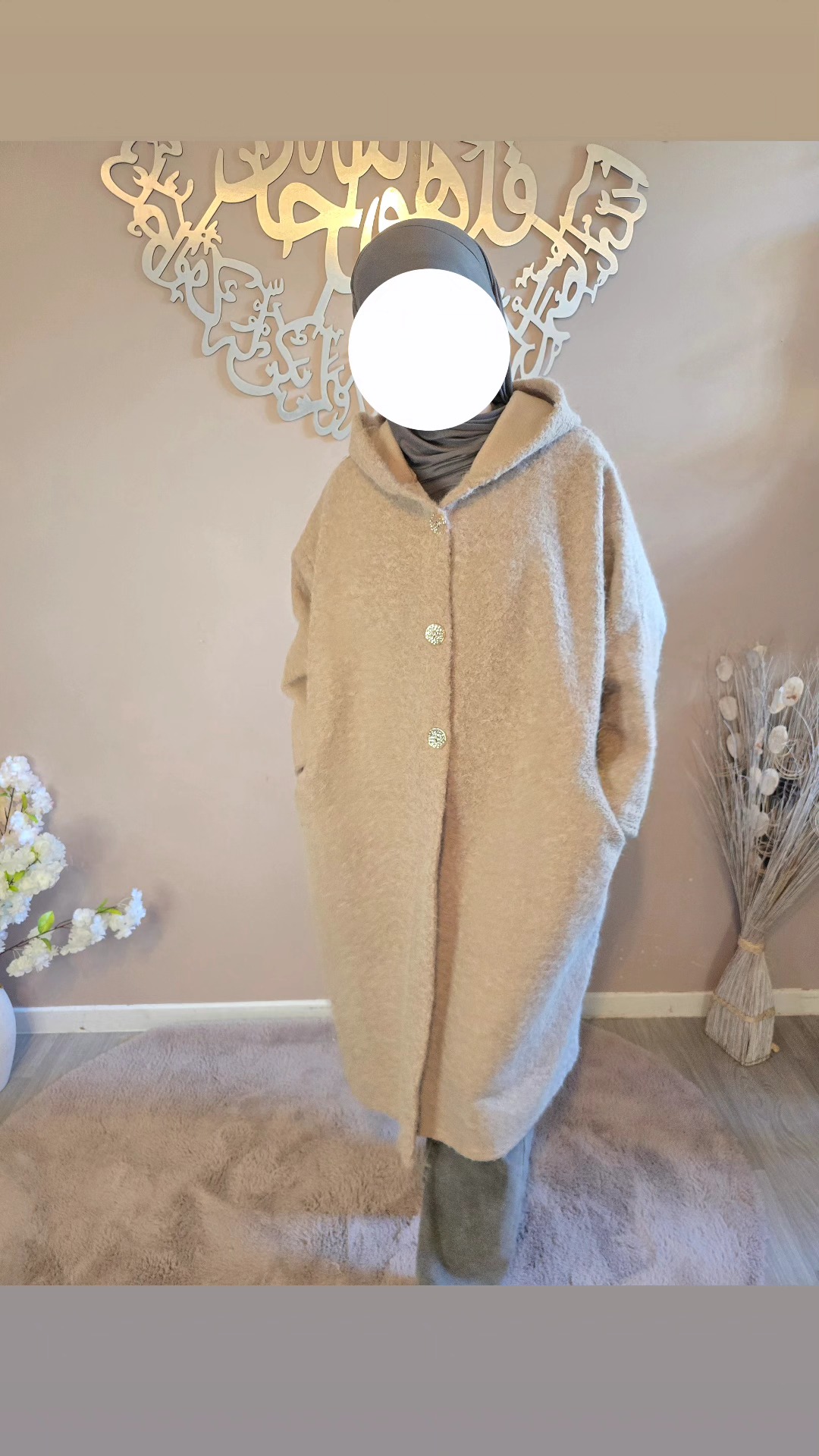 Dotée d’une capuche pratique et de trois boutons dorés sur le devant, elle marie subtilement le raffinement des détails et l’aspect fonctionnel. Ses deux poches amples latérales sont idéales pour garder les mains au chaud ou emporter l’essentiel avec soi. Avec une longueur mi-mollet (pour une taille de 1,62 m), la Veste Ruqqaya noire offre un tombé élégant qui structure la silhouette tout en allongeant la ligne.