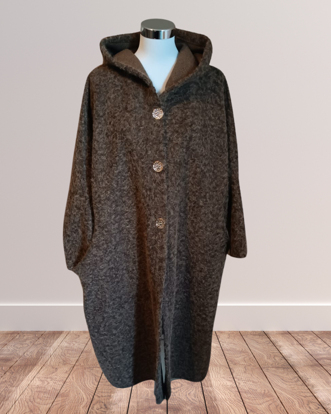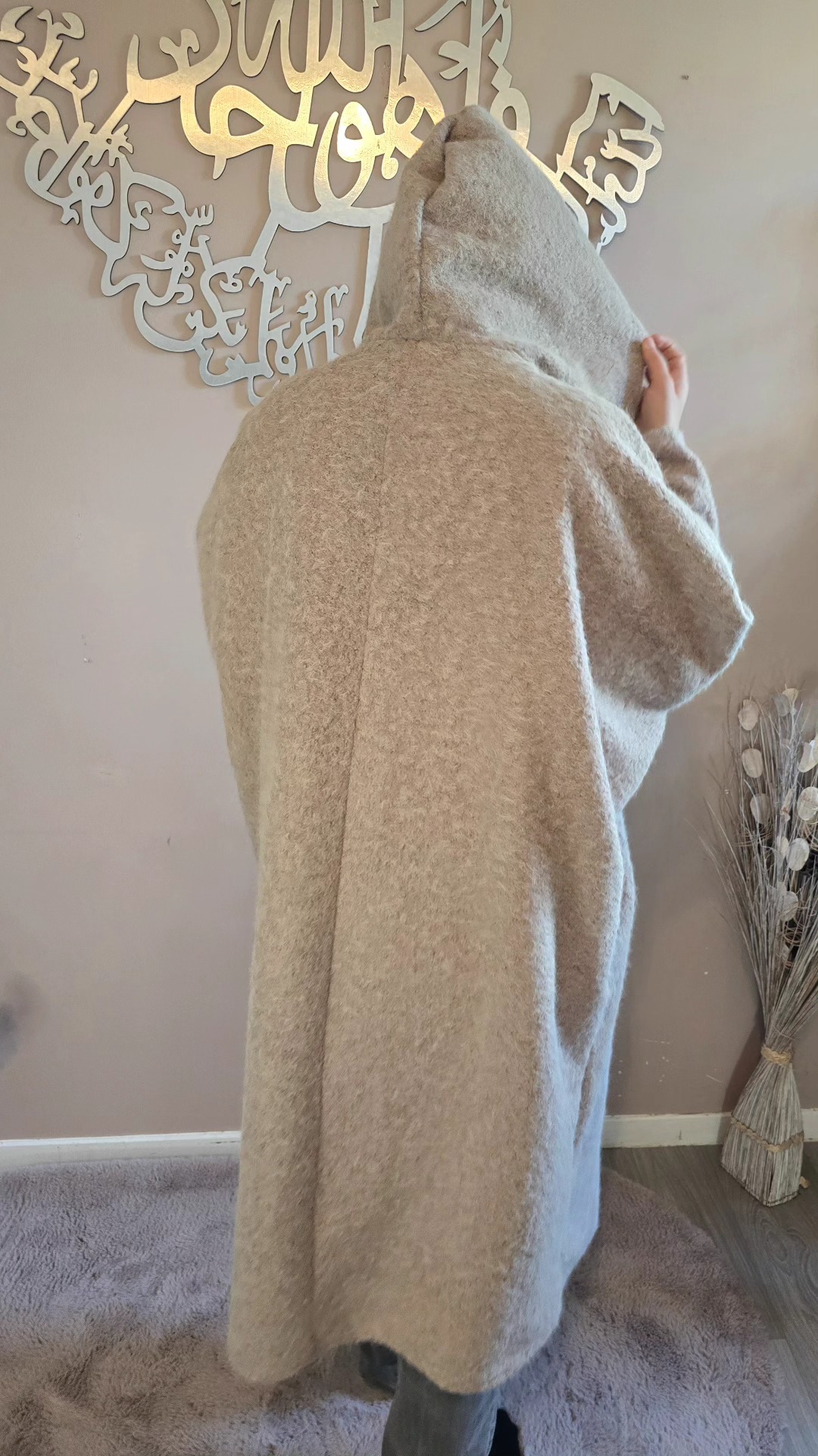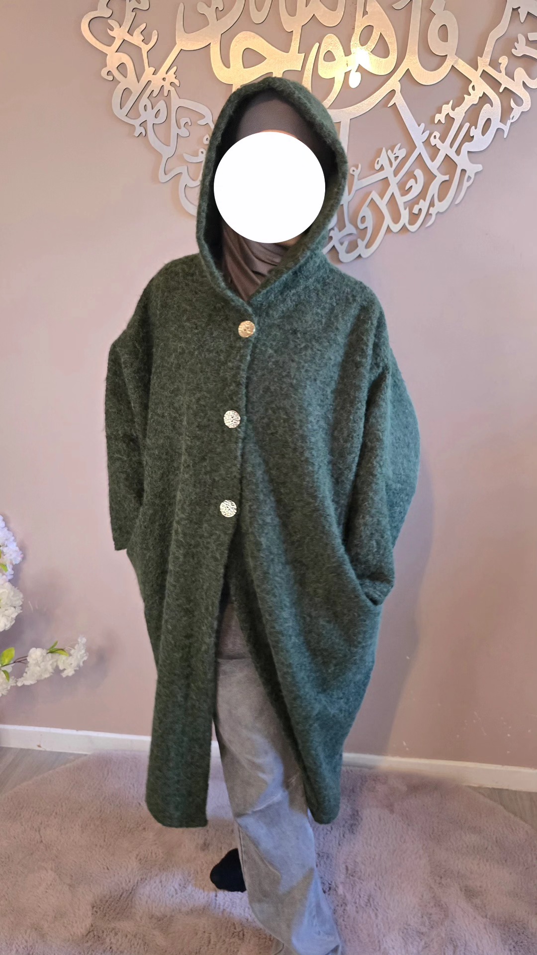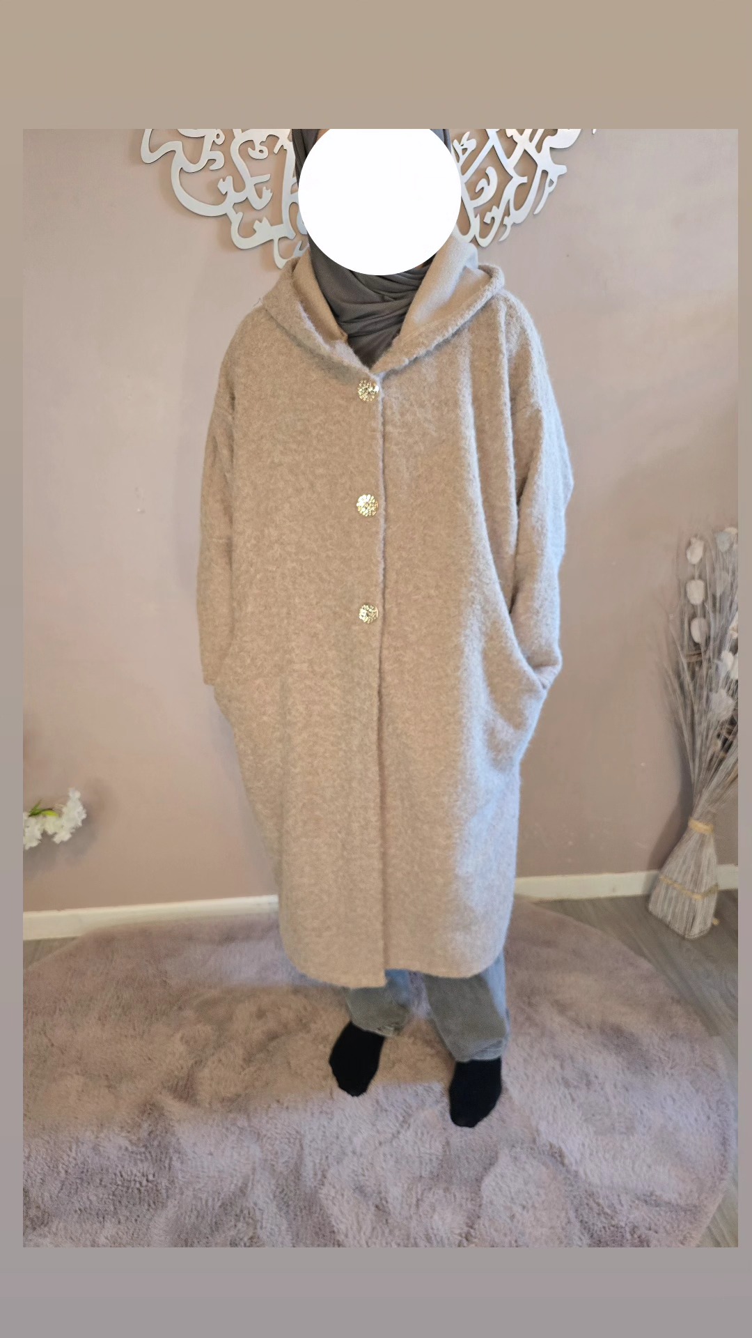 Dotée d’une capuche pratique et de trois boutons dorés sur le devant, elle marie subtilement le raffinement des détails et l’aspect fonctionnel. Ses deux poches amples latérales sont idéales pour garder les mains au chaud ou emporter l’essentiel avec soi. Avec une longueur mi-mollet (pour une taille de 1,62 m), la Veste Ruqqaya noire offre un tombé élégant qui structure la silhouette tout en allongeant la ligne.